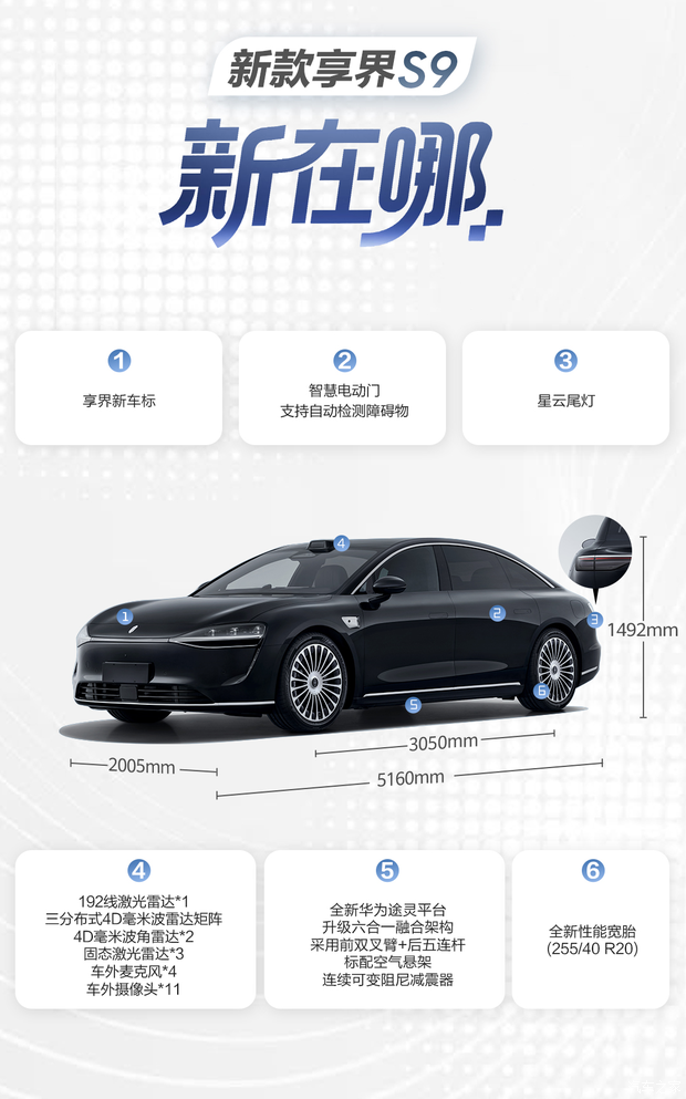 智能辅助驾驶方面,新款享界S9将配备4激光雷达(1个192线激光雷达,3个高精度固态激光雷达),有望新增3分布式4D毫米波雷达矩阵,拥有36个高精度传感器,搭载华为乾崑智驾ADS4,辅助驾驶能力和主动安全能力进一步提升。动力方面,享界S9提供纯电、增程两种能源形式,纯电版已于此前完成工信部申报,基于800V高压平台打造,搭载由华为数字能源技术有限公司所生产型号为TZ210XYA03的驱动电机,其最大功率为227千瓦。续航将超800公里;增程版车型将搭载华为雪鸮智能增程系统,CLTC综合续航里程超过1300公里。(文/汽车之家周易)